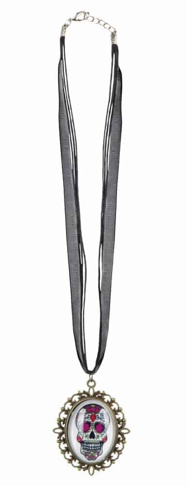 Un joli collier sur le thème de “Dia de los muertos“, un pendentif avec une magnifique tête de mort, vous allez pouvoir incarner un personnage gothique, cet accessoire est idéal pour compléter un déguisement d’Halloween. Avec ce bijou, il ne vous restera plus qu’a trouver le reste de votre panoplie pour votre prochaine soirée déguisée.