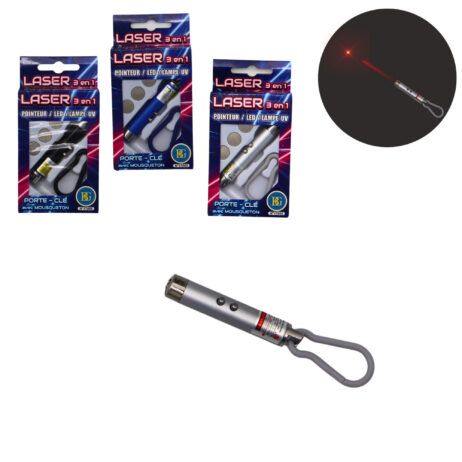 Une petite lampe torche pointeur laser de 7 cm avec un porte-clé mousqueton (voir photo), très apprécié comme petit cadeau par les enfants pendant une pêche à la ligne dans les kermesses ou fêtes d’écoles.