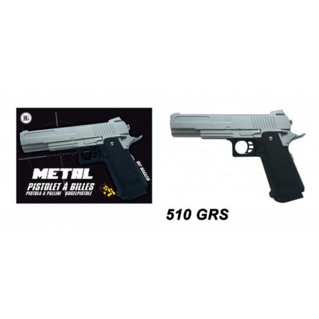 Pistolet à billes en métal de 23 cm, couleur gris. Très belle réplique pour jouer et s’amuser mais aussi une très bonne idée pour offrir à des amateurs de pistolet ou fusils a billes. Retrouvez toutes les armes factices proposées sur le site (armes diverses, pistolet, armes en mousse ou gonflables, accessoires de déguisements). Attention ! Ne pas viser le visage avec ce type de jouet. Interdit aux moins de 18 ans.